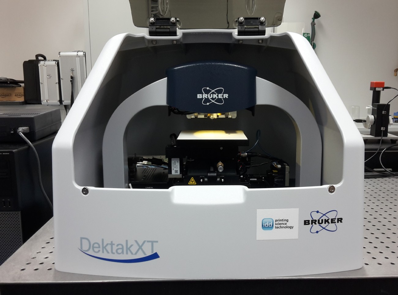 The DektakXT of the manufacturer Bruker is tactile profilometer which makes it possible to determine and characterize layer thicknesses and topographies as well as their roughness with a vertical resolution of 1 Å using a diamond stylus. The probes to be examined can be moved on a vaccum table in x and y direction as well as be rotated 360 ° software-controlled. The software enables to run pre-set measurement series and analysis routines fully automatically.